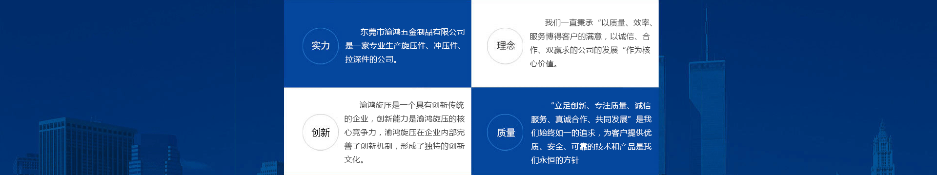 東莞市澤亮五金制品有限公司原東莞市渝鴻五金制品有限公司是一家專(zhuān)業(yè)生產(chǎn)旋壓件、沖壓件、拉深件的公司。公司具有強(qiáng)有力研發(fā)、生產(chǎn)、銷(xiāo)售的精英團(tuán)隊(duì)。渝鴻旋壓是一個(gè)具有創(chuàng)新傳統(tǒng)的企業(yè),創(chuàng)新能力是渝鴻旋壓的核心競(jìng)爭(zhēng)力,渝鴻旋壓在企業(yè)內(nèi)部完善了創(chuàng)新機(jī)制,形成了獨(dú)特的創(chuàng)新文化。在今后的發(fā)展當(dāng)中,渝鴻將不斷適應(yīng)市場(chǎng)需求,不斷研發(fā)旋壓產(chǎn)品以及沖壓件,滿(mǎn)足不同消費(fèi)者的需求,渝鴻愿與您攜手,共創(chuàng)渝鴻美好明天。